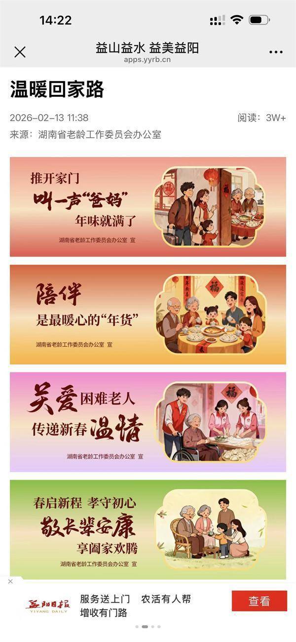 在湖南省老龄办的指导下,各市州也掀起了“温暖回家路”公益宣传的热潮。本次“温暖回家路”公益宣传活动形式多样、内容丰富、全面立体,全省14个市州参与其中。长沙市老龄办将公益广告宣传与人口老龄化国情教育线上大讲堂相结合,全社会积极应对人口老龄化思想观念显著增强,尊老敬老爱老的社会氛围更加浓厚;衡阳市老龄办宣传深入基层,统筹县、乡、村三级宣传力量,在集镇主干道、村部广场、文化活动中心等场所的宣传栏开展宣传;常德、益阳市、郴州市老龄办开展线下广泛宣传的同时,还将官方公众微信号作为宣传主阵地,构建多元化宣传阵地集群,渠道拓展,全域覆盖;株洲市、湘潭市、岳阳市、邵阳市、娄底市、怀化市、永州市、张家界市、湘西土家族苗族自治州老龄办发挥协调作用,在成员单位办公场地、交通枢纽、街道社区、电影院、养老机构、老年活动中心等场地开展宣传,形成上下联动、部门协同、社会各界广泛参与的局面,积极营造敬老爱老助老的社会氛围。截至当前,全省“温暖回家路”公益宣传点位过万处,推动“温暖回家路”主题公益宣传落地落细。