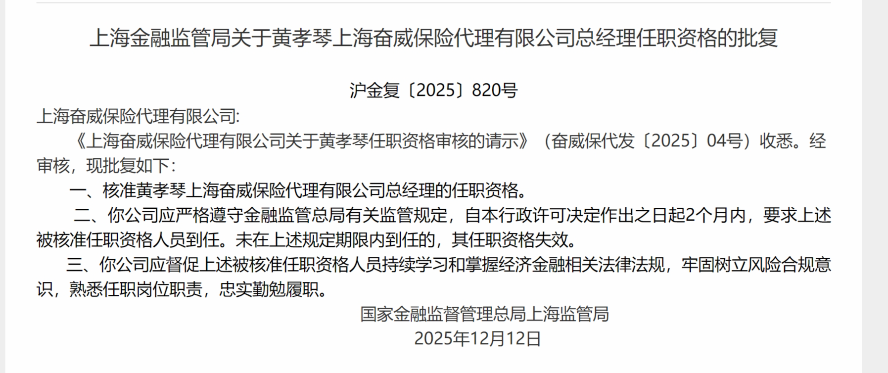 12月23日,上海金融监管局发布关于黄孝琴上海奋威保险代理有限公司总经理任职资格的批复,核准黄孝琴上海奋威保险代理有限公司总经理的任职资格。