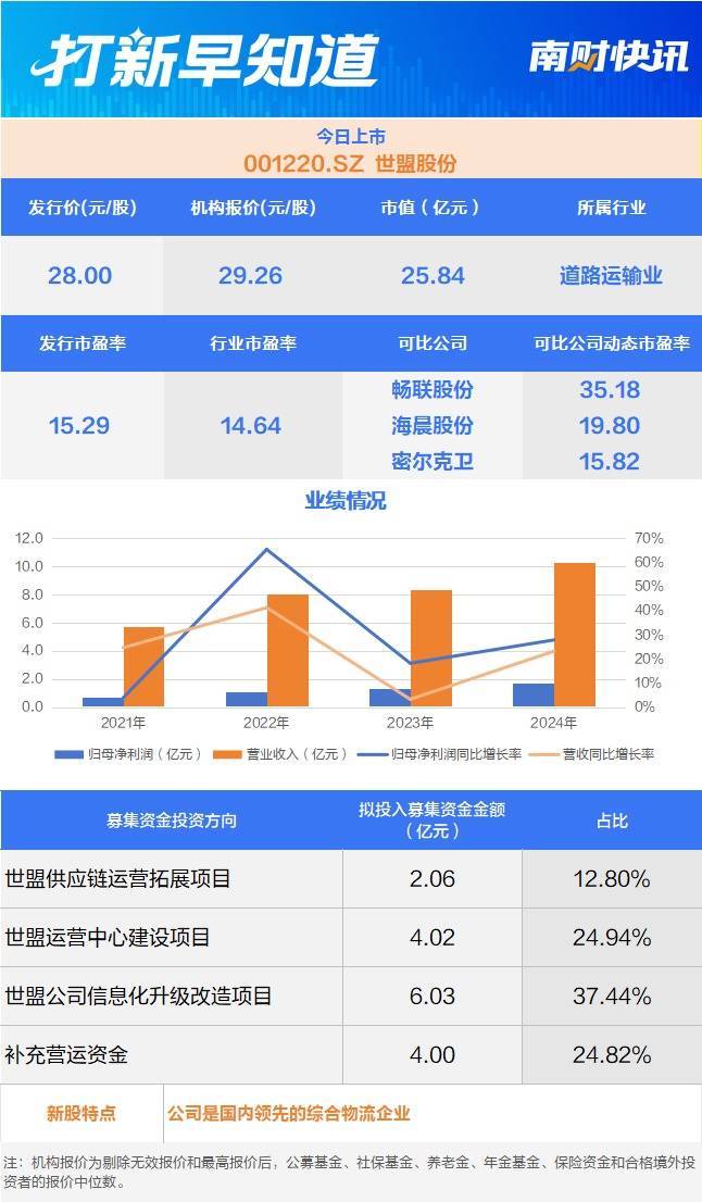 2月3日,有一只新股上市,为深市主板的世盟股份(001220.SZ)。该公司成立于2010年,主要专注于为生产制造业企业提供包括供应链综合物流服务和干线运输服务在内的全方位、一体化供应链合同物流服务。
