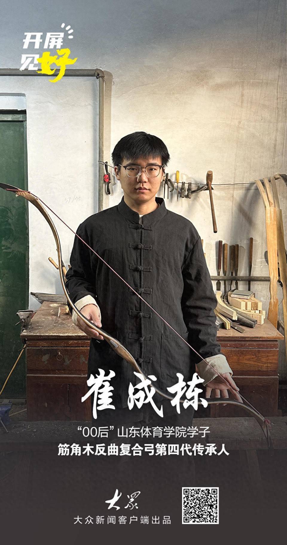 说这话的,是山东体育学院2022级学生崔成栋。这位“00后”青年,还有另一个身份——古老制弓技艺的市级、县级非遗代表性传承人。在他手中,古老的筋角木反曲复合弓不再是博物馆里的静物,而是连接千年文明与当下生活的活态桥梁。