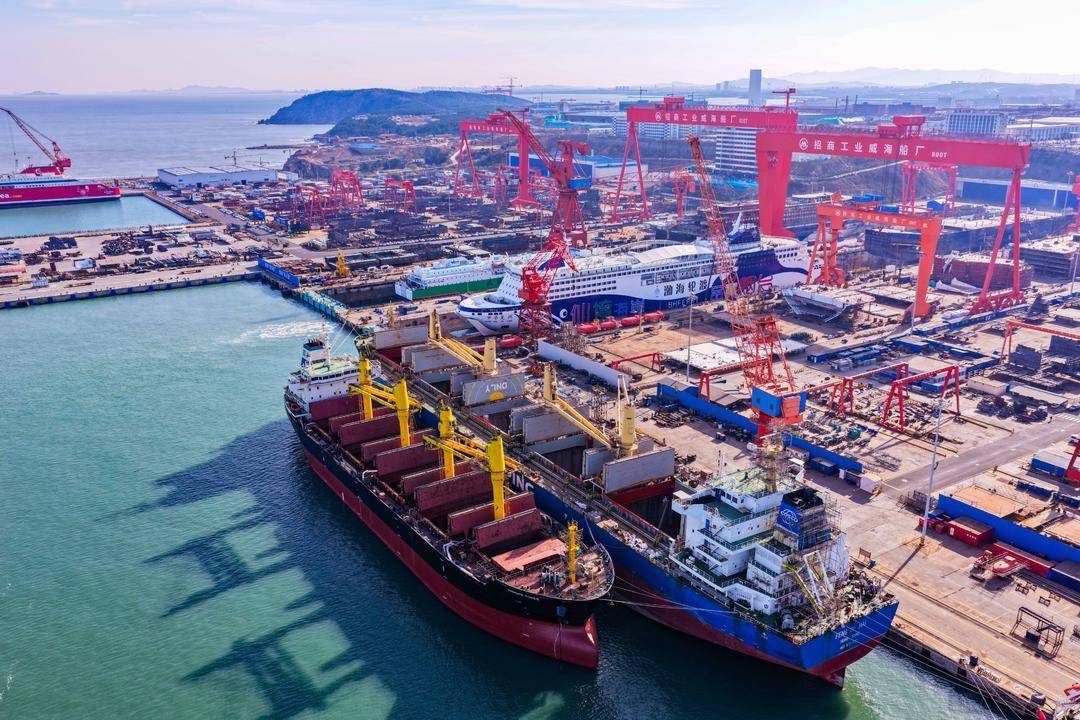 位于威海市的招商局工业集团威海船舶有限公司,多艘大型船舶正在建造中。