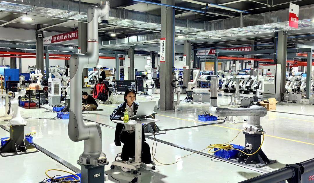 在珞石智能制造未来工厂,技术人员在测试柔性协作机器人。
